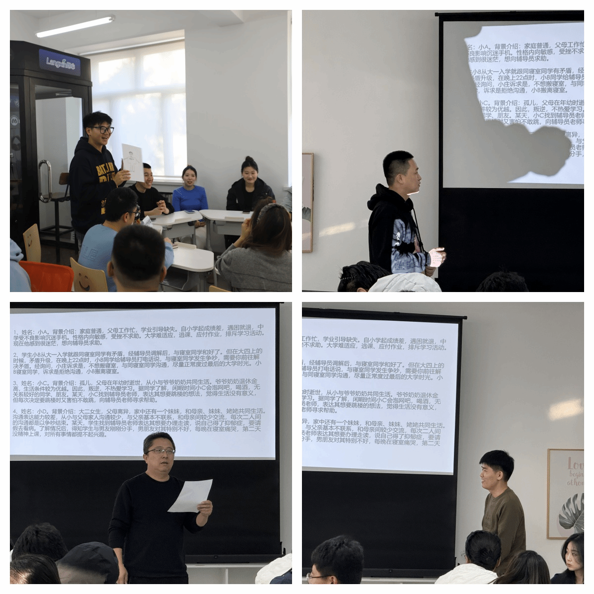 在“共话成长”环节,各小组辅导员从学业困难、家庭经济困难、心理问题、恋爱问题及寝室矛盾问题等多角度,与“行知”辅导员工作室成员扮演的“问题学生”进行深入的谈心谈话。工作室成员将学生的困惑、焦虑、叛逆等情绪表现得淋漓尽致,现场呈现出强烈的代入感。在耐心倾听“问题学生”的心声后,辅导员运用丰富的专业知识与实践经验,引导“问题学生”打开心扉,深入剖析问题,并给出切实可行的解决方案。