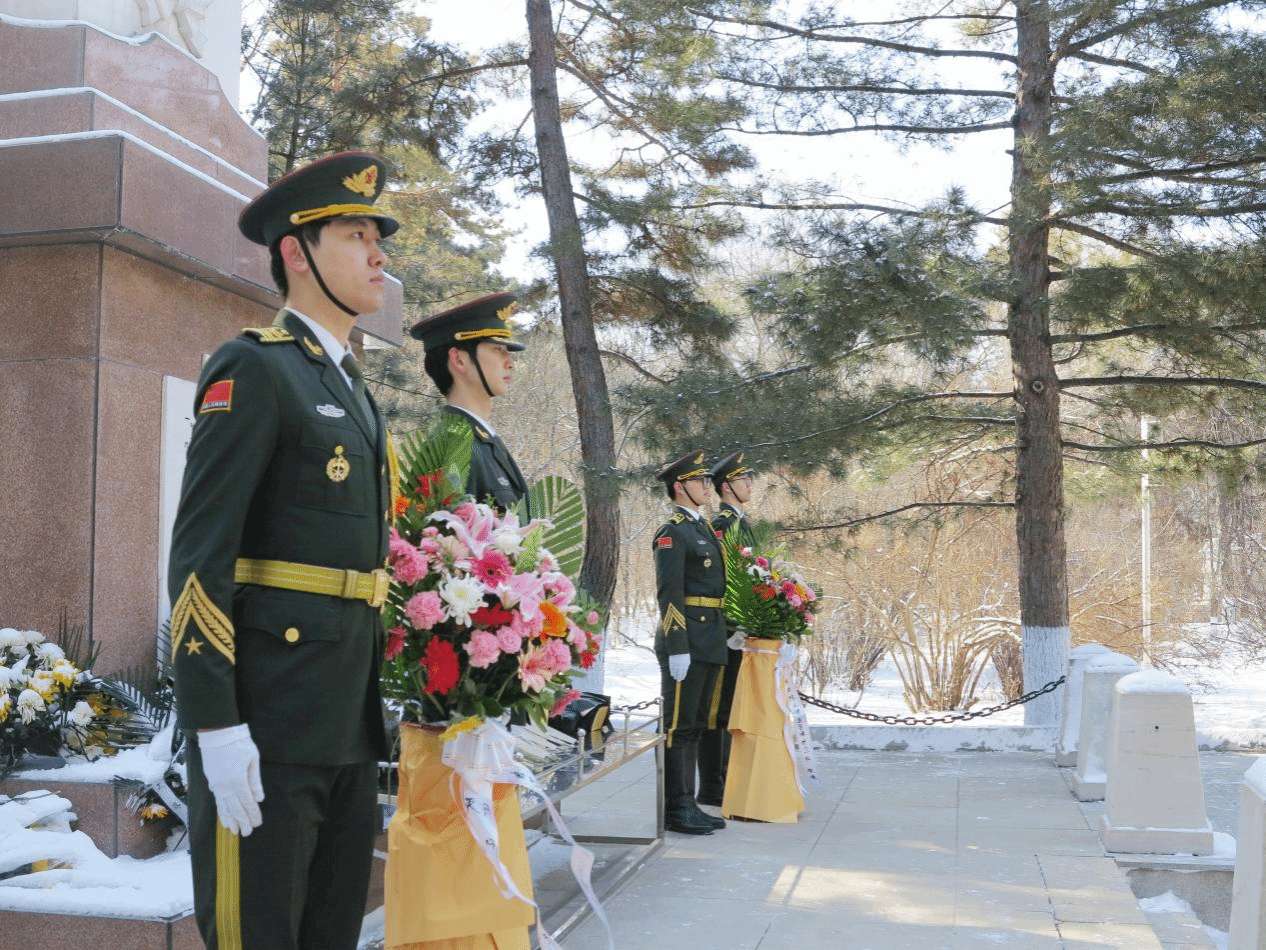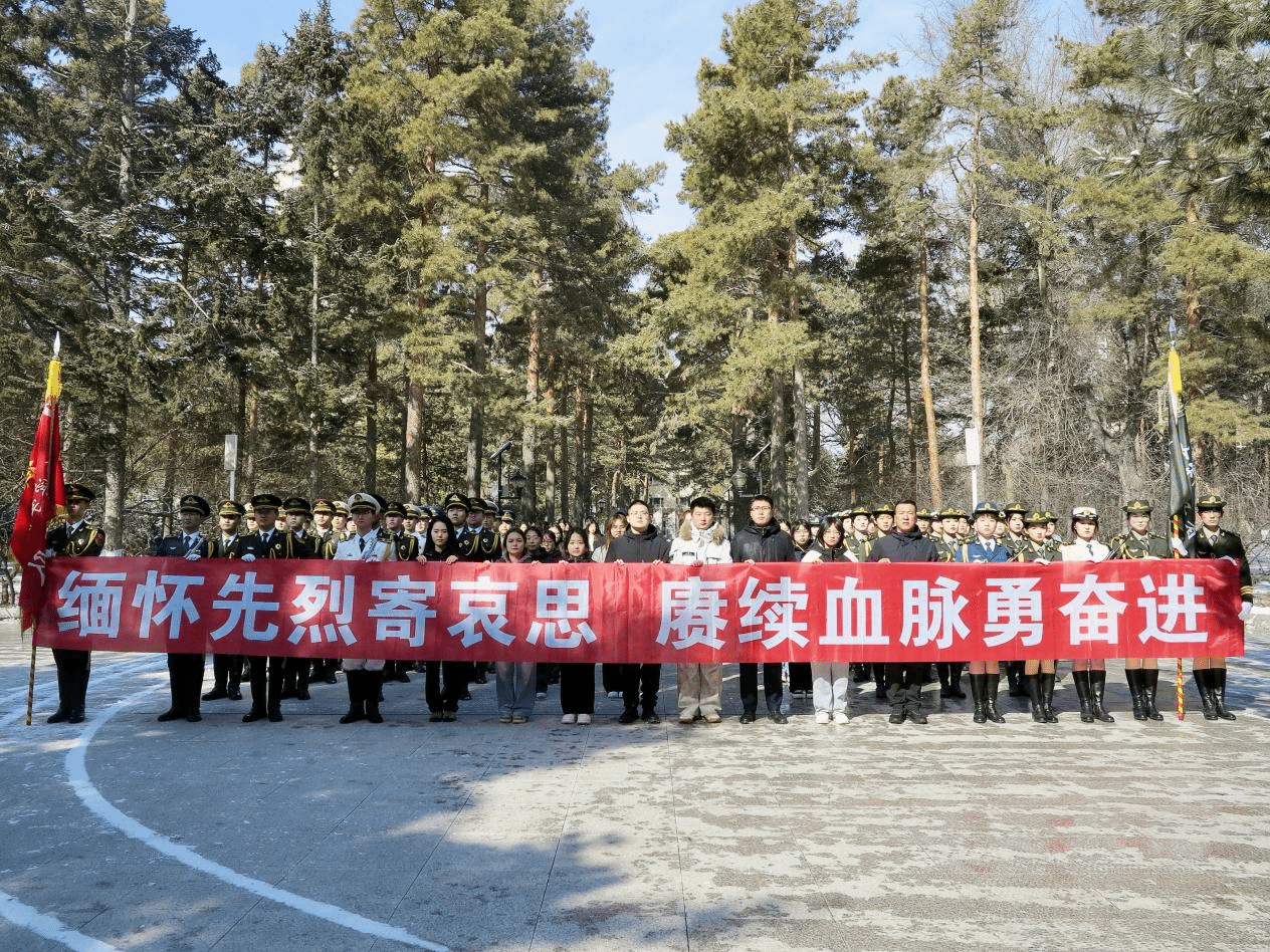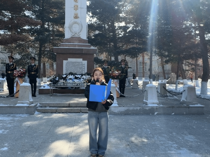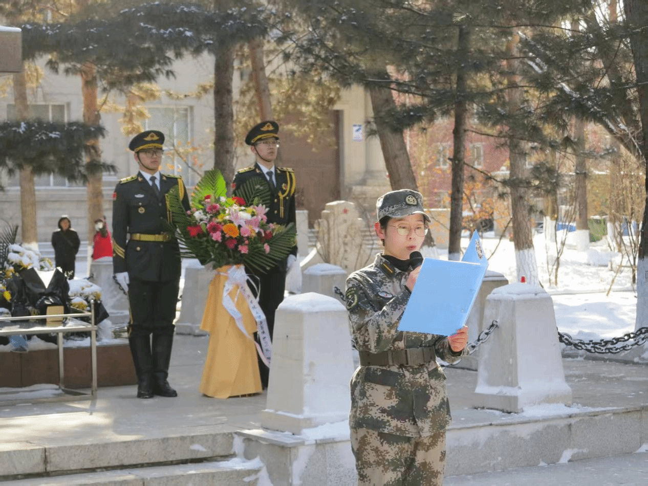 上午9时,伴随《献花曲》低回的旋律,国旗护卫队队员将承载哀思的花篮缓缓抬至烈士纪念碑前。全体师生肃立,向为民族独立、人民解放献出生命的革命先烈默哀。来自经济管理学院的维吾尔族学生迪丽拜尔·阿曼拉作为少数民族学生代表发言:“从天山到松江,在烈士们用生命铺就民族团结之路上,我们定将石榴籽般的精神代代相传。”哈尔滨学院大学生国旗护卫队队员、外国语学院王金鸽在发言中号召大家继承先烈遗志,传承英雄精神,勇于担负起时代赋予青年的职责和使命。随后,学生处老师带领全体学生党员重温入党誓词,铿锵的语句、仰望的丰碑激励鼓舞着在场的每一个人。