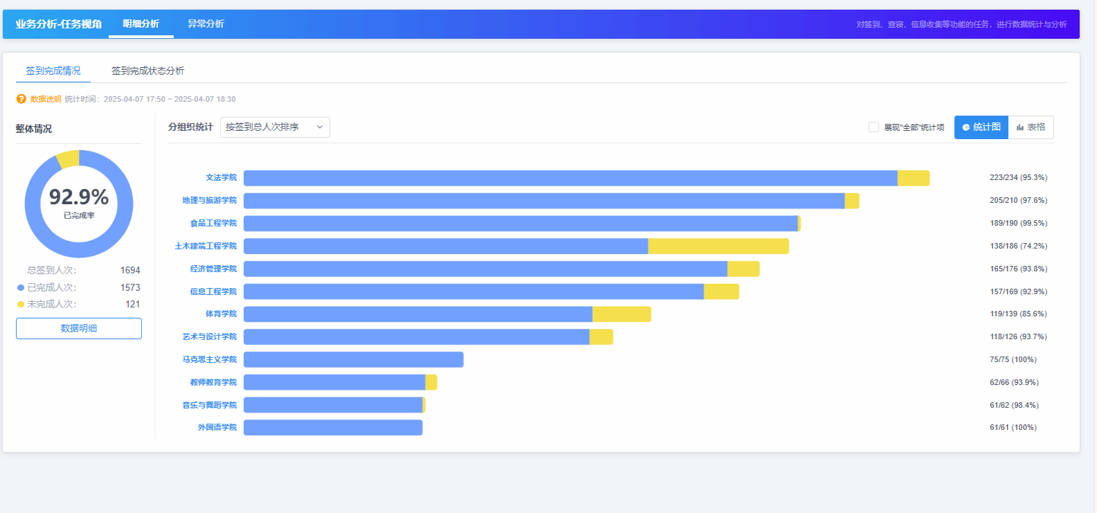 4月7日首轮检查依托“辅导猫”APP智能定位系统,构建“云端督导”。各学院新生通过实时定位签到的方式反馈晚自习动态,学生处后台同步生成覆盖全校的“晚自习签到完成情况热力图”数据模型,系统数据显示,全校晚自习出勤率达到92.7%(含请假学生),10个学院出勤率在90%及以上。