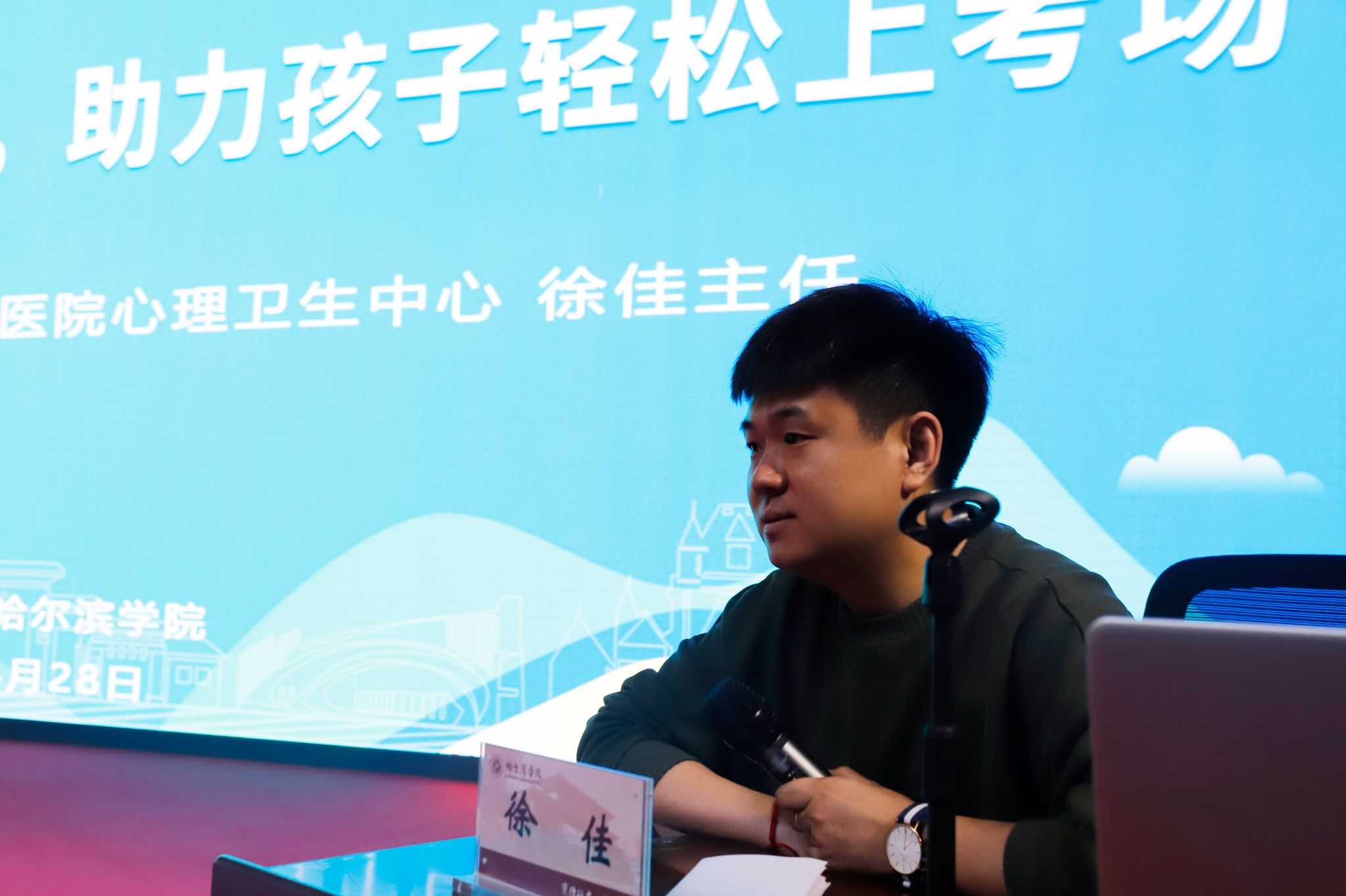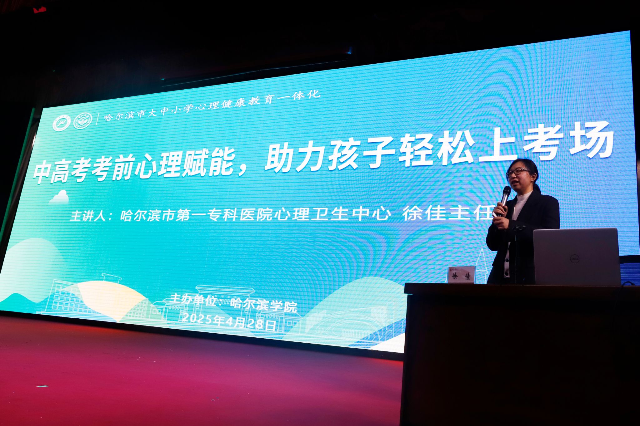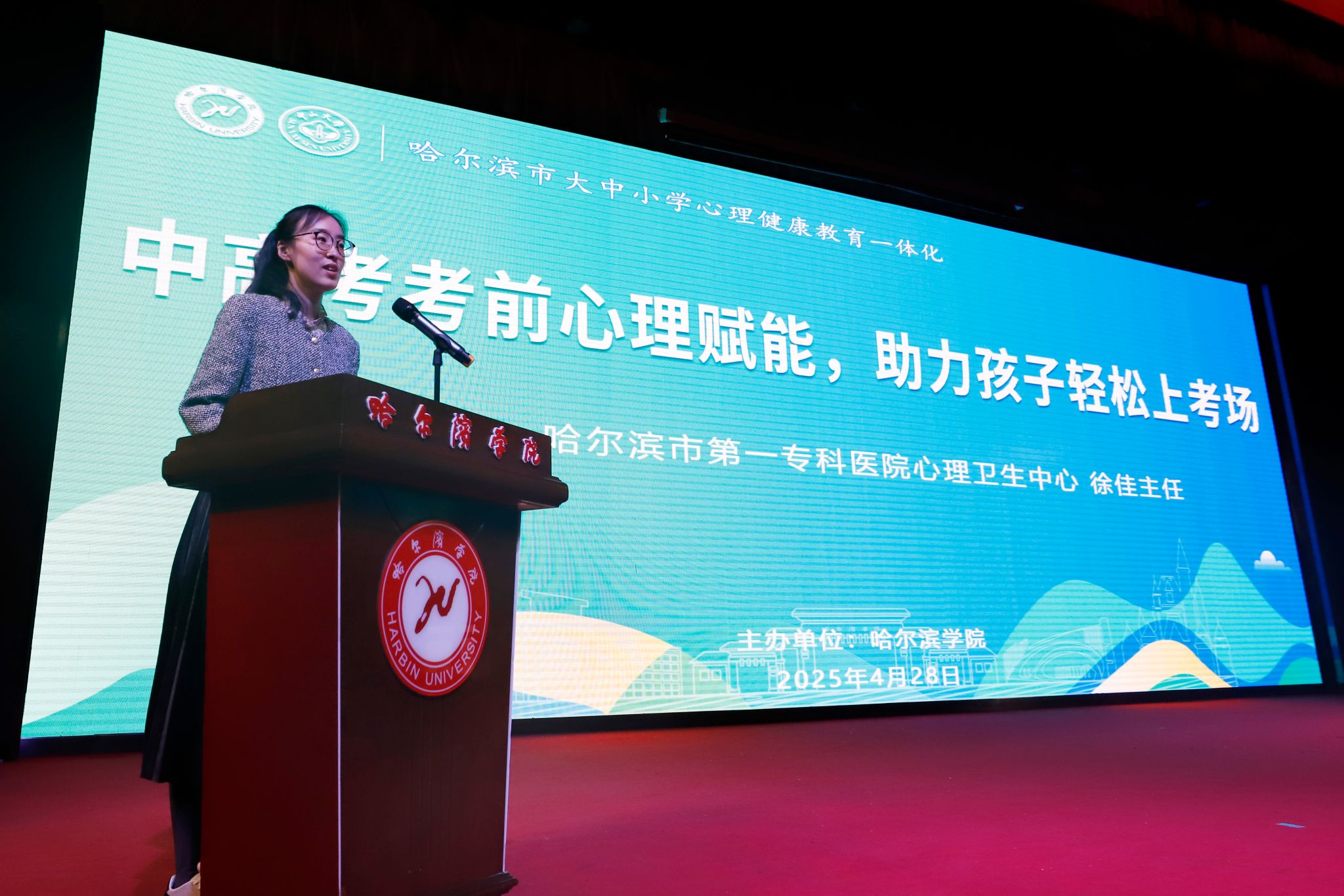 (文/张悦)为深入推进大中小学心理健康教育一体化,助力中、高考考生家长应对孩子考前焦虑问题,帮助家长理解孩子考前心理状态,掌握科学应对方法,提升备考家庭心理调适能力,使考生以积极的心态迎接考试。4月28日,我校与哈尔滨市教育局在图书馆报告厅共同举办“中高考考前心理赋能,助力孩子轻松上考场”公益讲座。讲座特邀哈尔滨市第一专科医院心理卫生中心徐佳主任担任主讲嘉宾,学生处处长于迪、副处长庞哲,哈尔滨市兼职心理教研员、哈尔滨市163中学、73中学家长代表共400余人参加讲座。