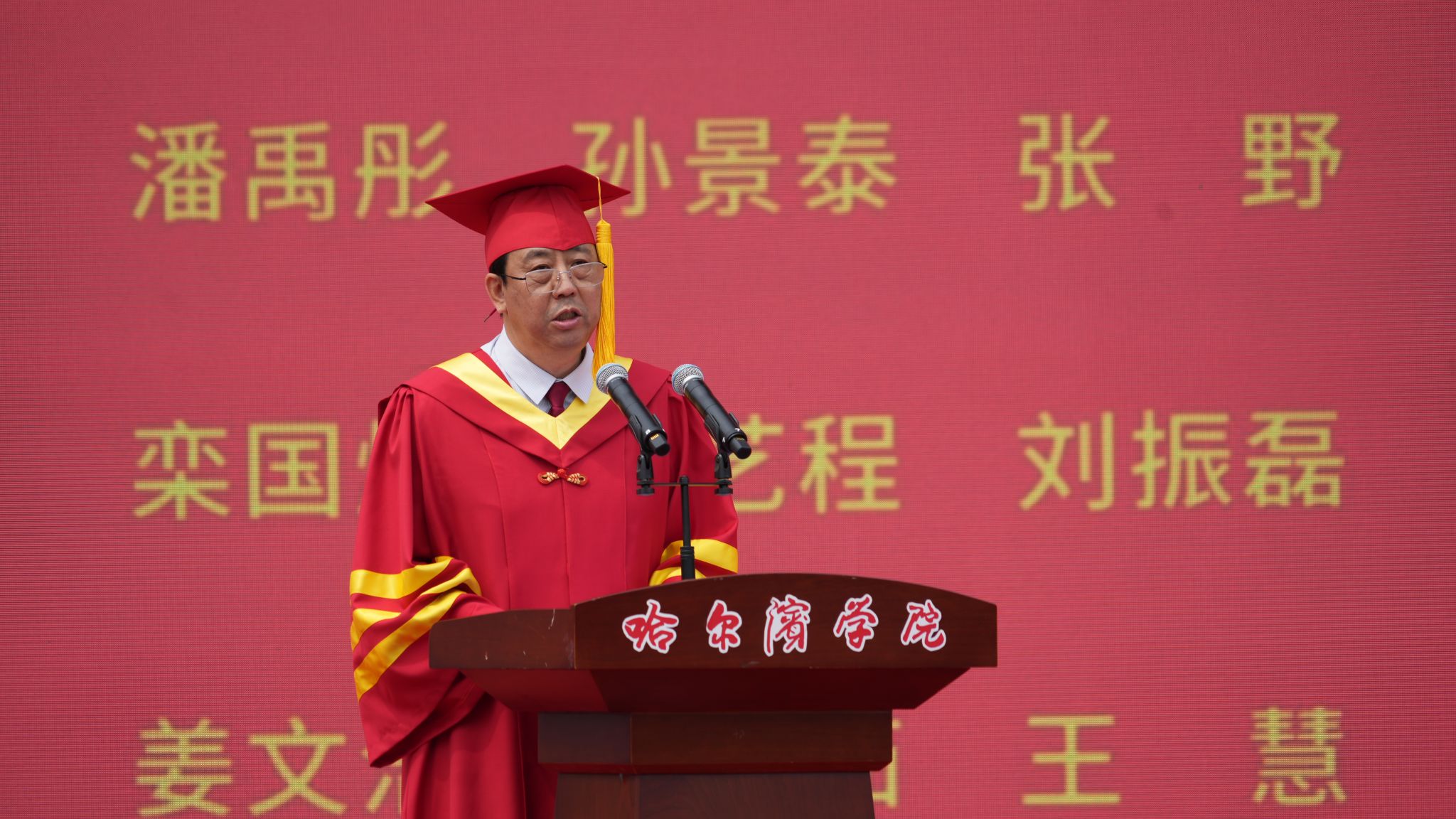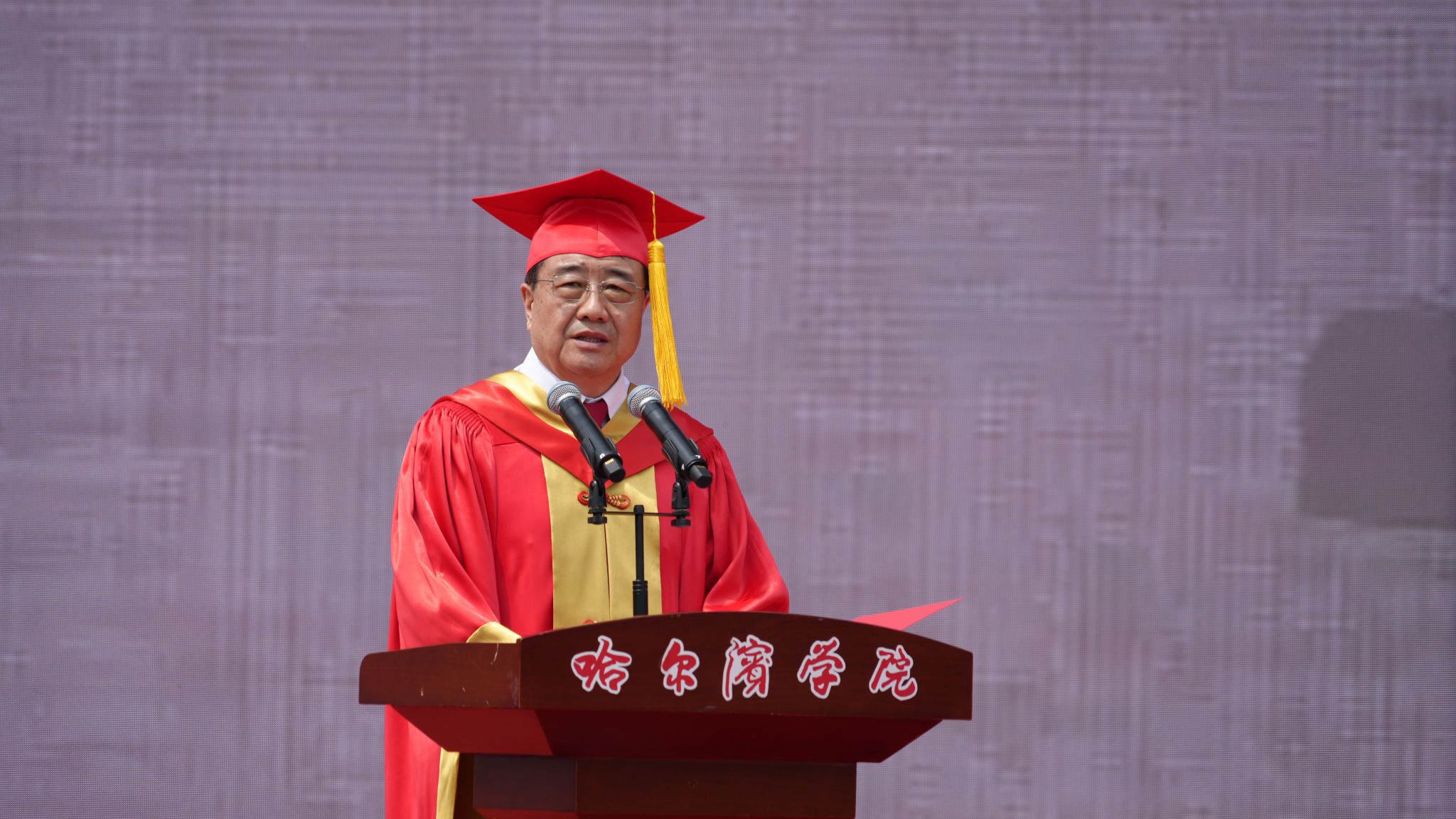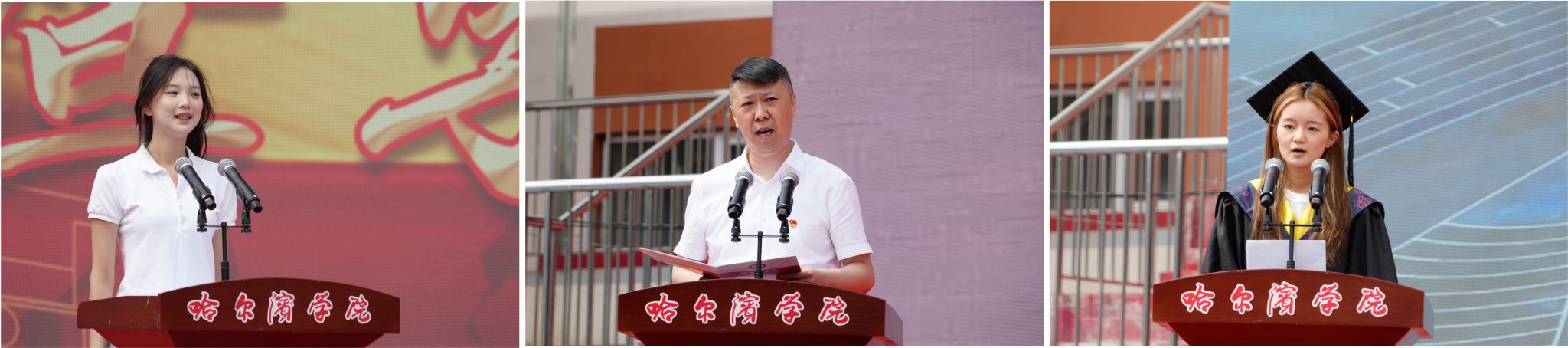 典礼上,于少鹏、孙红镱分别宣读了《哈尔滨学院关于2025届学生毕业与学士学位授予的决定》《哈尔滨学院2025届“优秀毕业生”名单》及《2025年黑龙江省普通高等学校“优秀毕业生”名单》。吴旭峰、陶成云、潘俊豪共同为毕业生代表颁发毕业证书。教师代表、毕业生代表、在校生代表作发言。