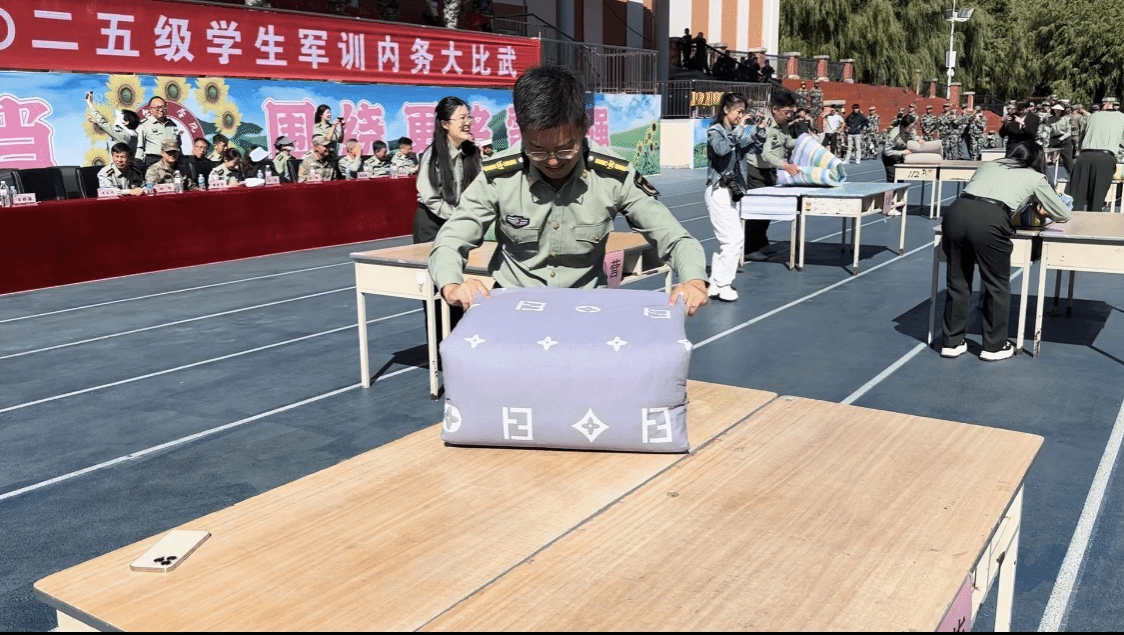 随后进行的教官展示环节将现场气氛推向高潮。承训教官以精湛的技艺和标准化操作,在短时间内叠出棱角分明、整齐划一的“豆腐块”军被,展现出过硬的军事素质和优良作风,为全体参训学生树立了学习典范。