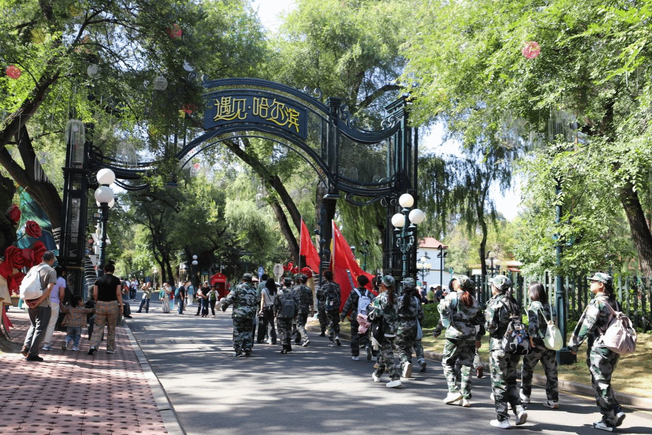 清晨六时许,晨光初照,拉练队伍整齐列队,伴随着响亮的口令,从斯大林公园整装出发,途经人民防洪胜利纪念塔、哈尔滨市青年宫、中东铁路桥、双拥国防教育街等历史地标。行进途中,学生们步伐铿锵、队容严整,各营旗帜飘扬,口号声此起彼伏,展现出军人般的纪律意识和昂扬斗志。在长达数小时的徒步过程中,参训学生相互扶持、彼此鼓励,无一人掉队,以实际行动诠释了“流血流汗不流泪,掉皮掉肉不掉队”的军人特质。