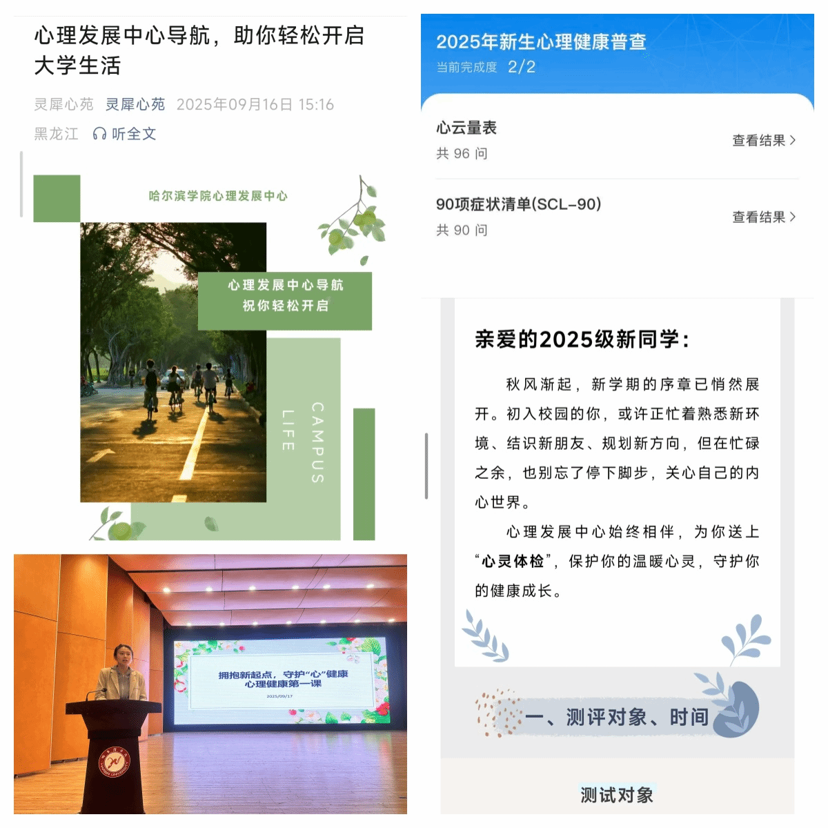 学生处心理发展中心举办新生体验营活动,通过互动小游戏、手工作坊等活动,潜移默化的普及心理健康知识;开展新生心理健康普测,介绍心理发展中心的职责、功能、服务内容及预约方式,引导新生关注自身心理健康,掌握寻求帮助办法。各学院组织开展心理健康讲座,提升心理调适能力。