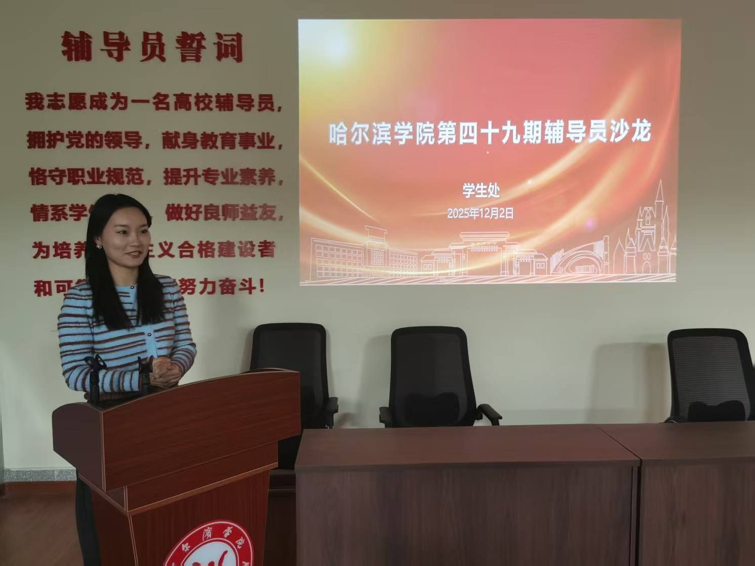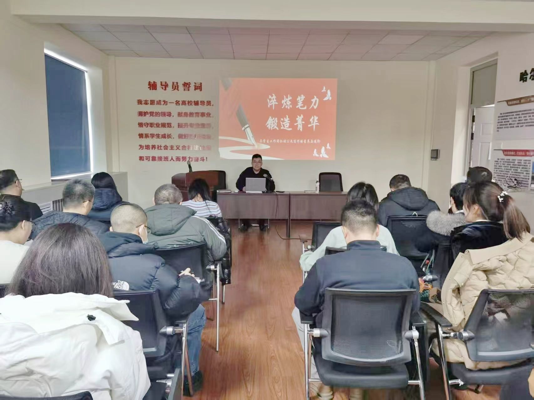 (文/柳思为)为进一步加强我校辅导员队伍专业能力建设,夯实公文写作能力基础。12月2日,我校在崇德楼辅导员之家举办辅导员公文写作能力提升专题沙龙。本次活动由“匠心”辅导员工作室承办,各二级学院副书记、全体辅导员以及学生处全体人员参加。学生处副处长卢涛担任主讲嘉宾。