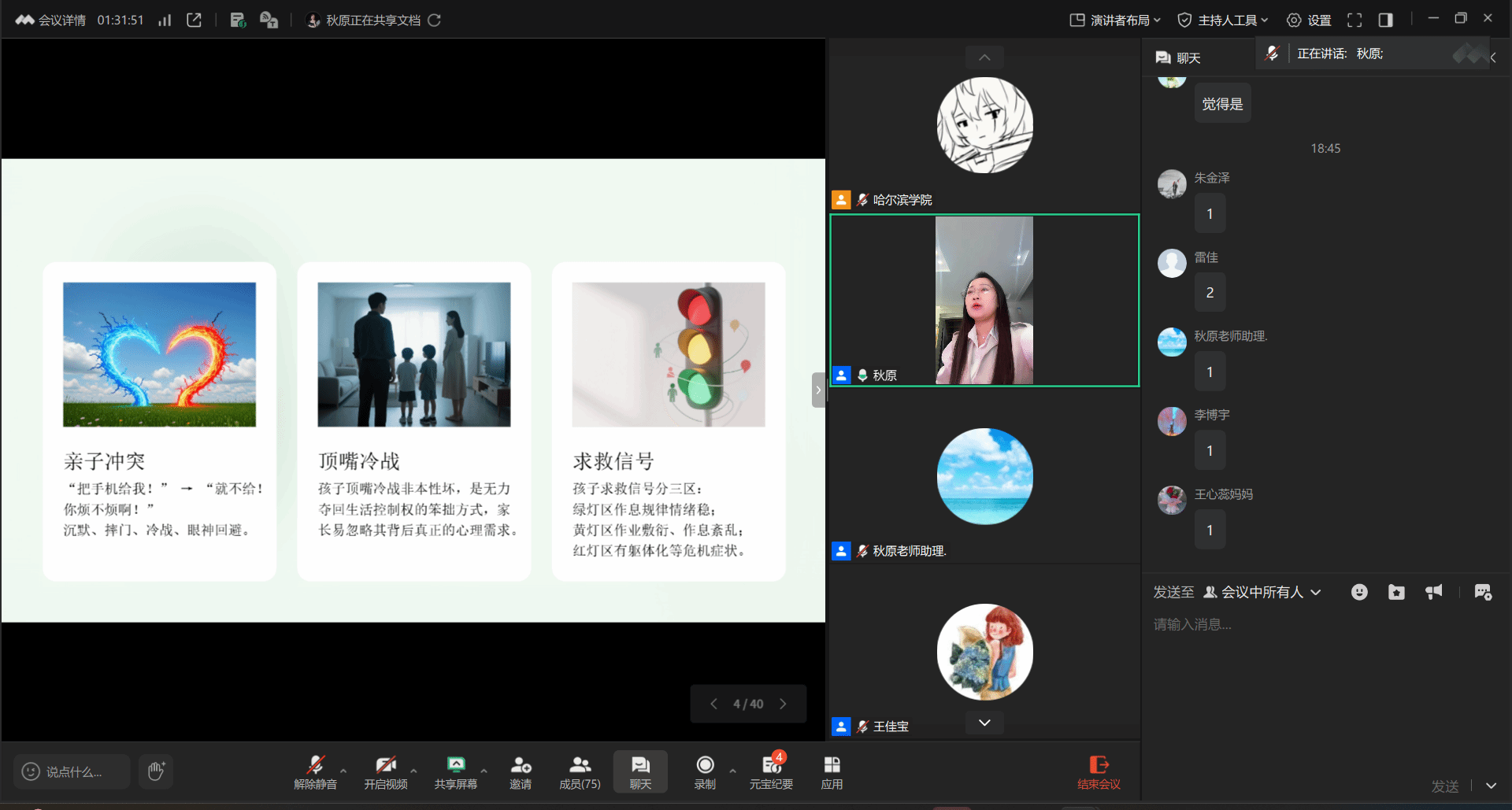 为深入推进哈尔滨市大中小学心理健康教育一体化建设,帮助家长与教师掌握科学的沟通方法,提升家校协同育人实效。4月3日晚,由哈尔滨学院主办的“哈尔滨市大中小心理健康教育一体化”系列线上讲座正式拉开帷幕。第一期主题为《爱要会表达:破解青春期亲子沟通的死局》,特邀资深心理咨询师秋原老师担任主讲,吸引了全市大中小学众多家长、中小学教师,以及我校辅导员、班主任、家长朋友们在线参与。