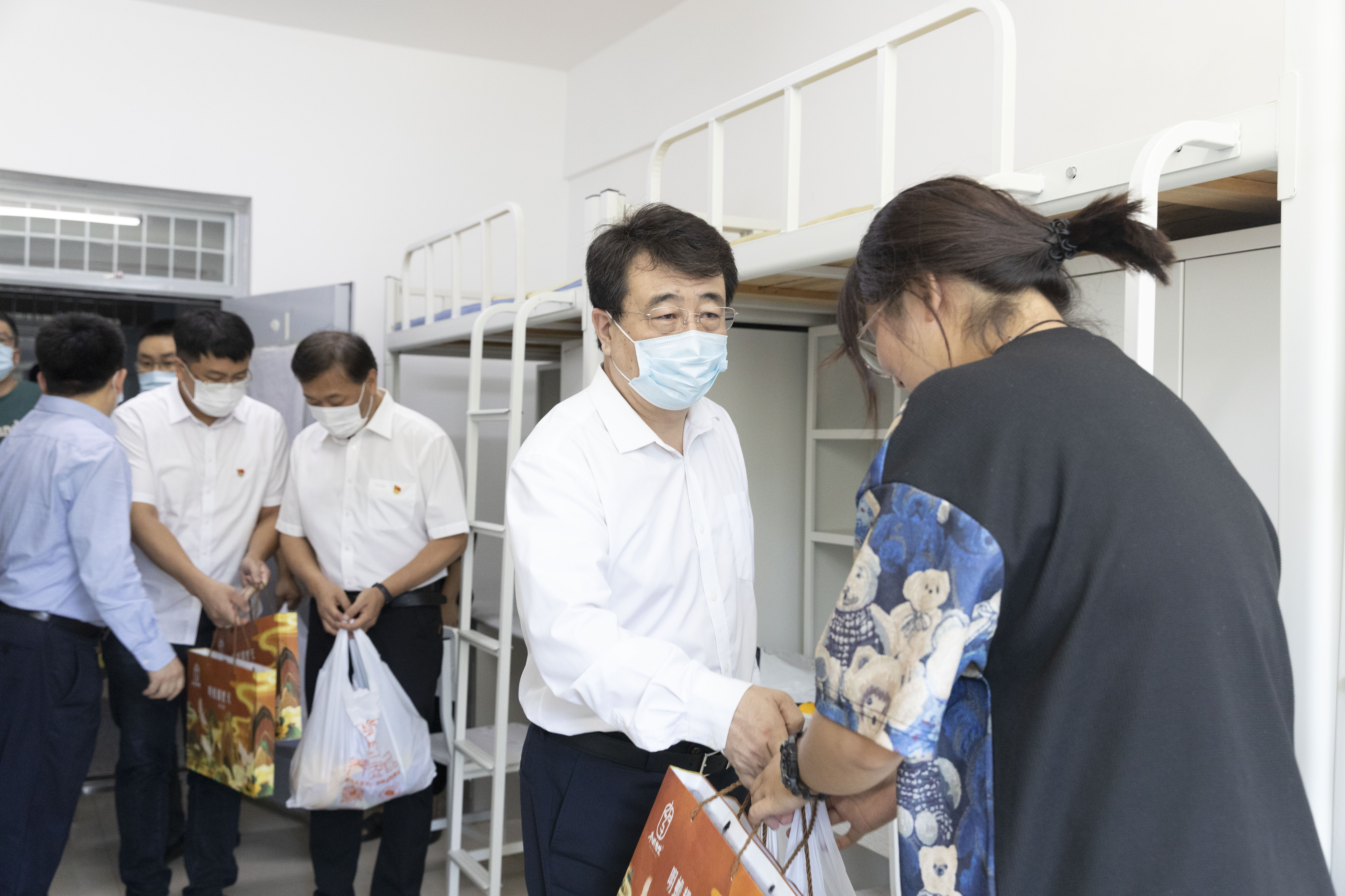 于成学校长一行分别看望了18名已入校的2022级新生同学和特困生代表,送上中秋慰问礼包,从饮食、住宿、快递收发、生活习惯等方面与同学们进行了深入交流。他表示,每逢佳节倍思亲,新生同学们刚刚踏入大学校园,便遭遇疫情,难免会想家,大家要调整好心态,逐渐适应校园生活,如果遇到困难,及时与辅导员联系,学校会第一时间帮助解决。在看望特困生代表时,于校长仔细询问了特困生的家庭状况与实际困难。他表示,学校始终高度重视特困学生的学习生活,通过发放相关奖学金、助学金和生活补贴、畅通助学贷款通道、设立勤工助学岗位等方式,着力帮助特困学生解决生活困难,顺利完成学业。同学们要相信学校永远是你们的坚强后盾,绝不会因家庭经济困难让任何一名学生辍学。