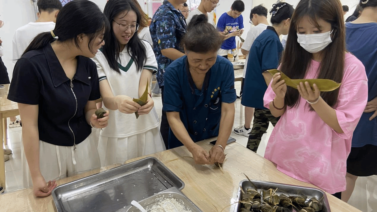 活动中,同学们摩拳擦掌、围成一桌,经过食堂工作人员的细心指导,同学们认真的将红枣镶嵌在糯米中,再用粽叶将糯米紧紧包裹,就这样一个个体态饱满,饱含节日祝福的粽子就诞生了。