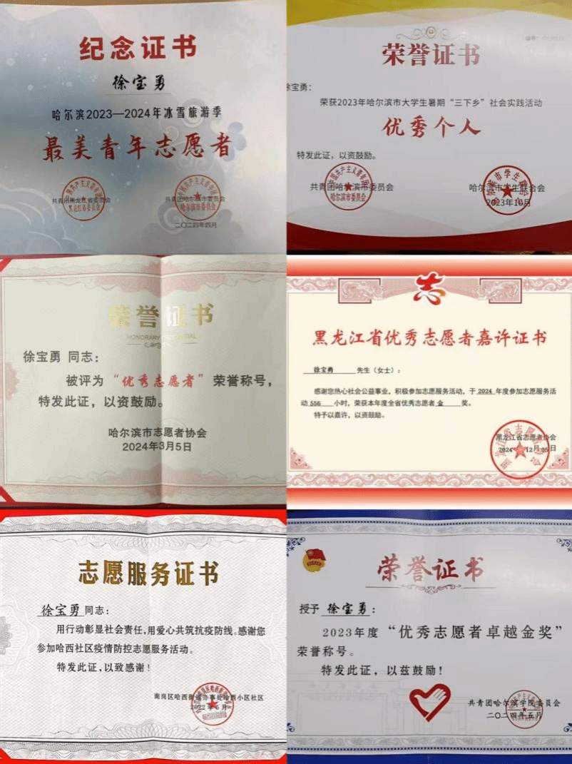 自入校以来,他积极参与各类志愿服务活动,无论是社区环境治理、人口普查,还是献血车进校园,总能看到他忙碌的身影。四年来,徐宝勇的累计志愿服务时长已达数千小时,并多次荣获优秀志愿者称号。