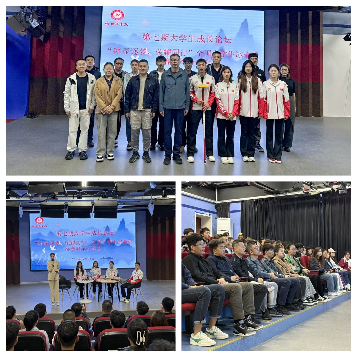 (文/盖铁生)为全力打造具有我校特色的校园冰雪文化品牌,弘扬 “为国争光、顽强拼搏” 的体育精神,9月24日下午,学生处在崇德楼401演播室举办第七期大学生成长论坛,活动以“冰壶逐梦,荣耀同行”为主题,邀请第五届全国大学生冰壶锦标赛冠军——哈尔滨学院冰壶队队员代表分享参赛获奖心得。学生处副处长庞哲、辅导员代表、各二级学院学生、少数民族学生和贫困生代表参加了此次活动。