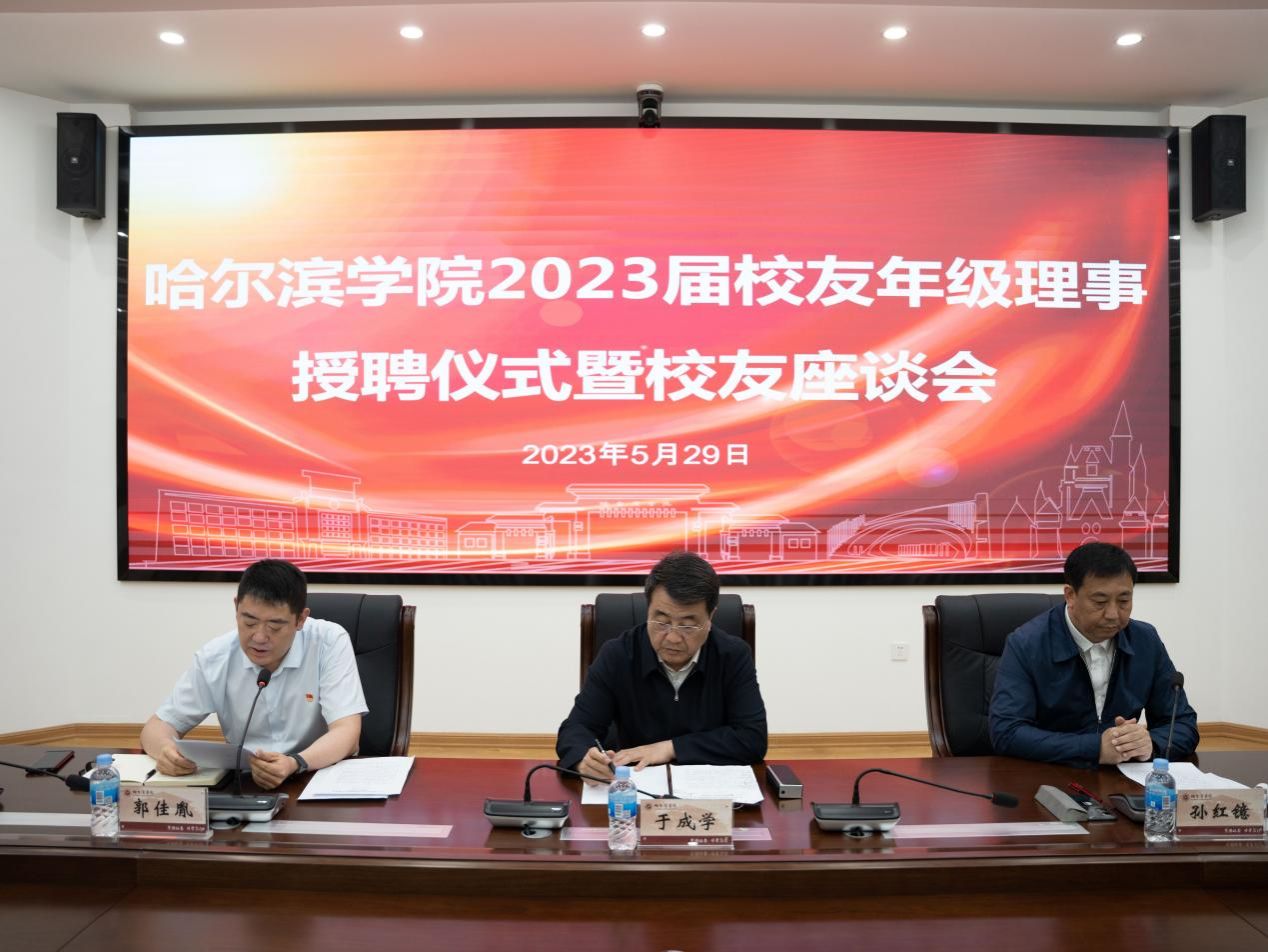 5月29日下午,哈尔滨学院2023届校友年级理事授聘仪式暨毕业生座谈会在党政办公楼404会议室举行。校长、党委副书记于成学出席会议并讲话。二级学院院长、书记,校友工作联络员,党政办公室负责同志以及33名2023届校友年级理事代表参加会议。会议由副校长孙红镱主持。