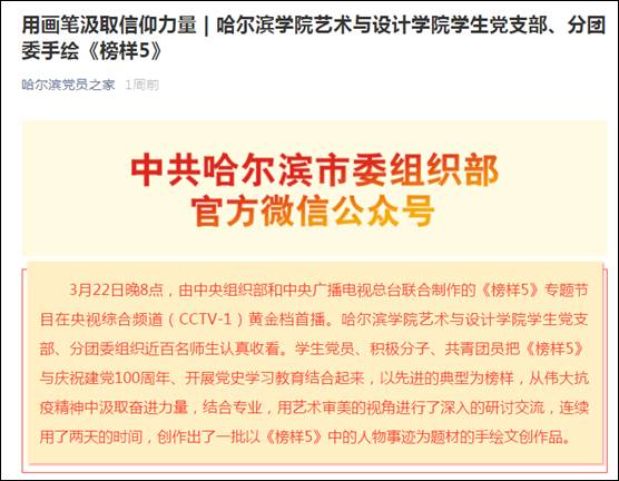 哈尔滨学院艺术与设计学院学生党支部、分团委组织近百名师生认真收看了《榜样5》专题节目,党总支书记孙国辉、副书记康根东、学生党支部书记郭鹏程、赵健、支部委员孙家宝、分团委书记郭忠志参加了首播活动。中组部官网、省委组织部、哈尔滨市委组织部官微三级媒体都进行了报道。