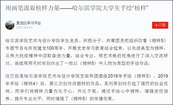 作品完成后,陆续在中组部、中共黑龙江省委组织部、中共哈尔滨市委组织部官微、官网、学习强国平台刊发,同时,在校党委宣传部的悉心指导下,在我校龙江“四大精神”文创展览馆举办了线下展览。