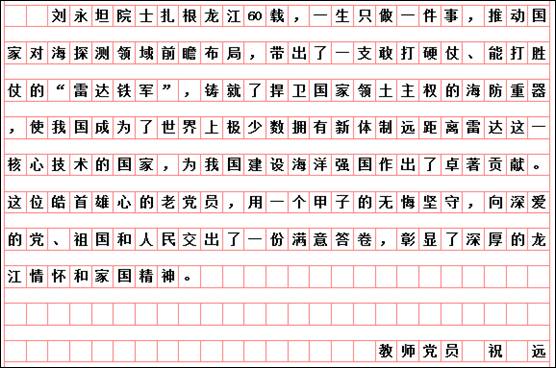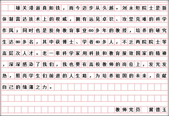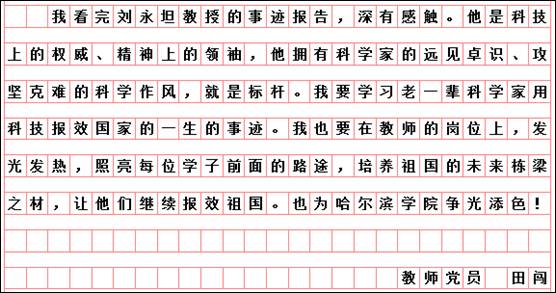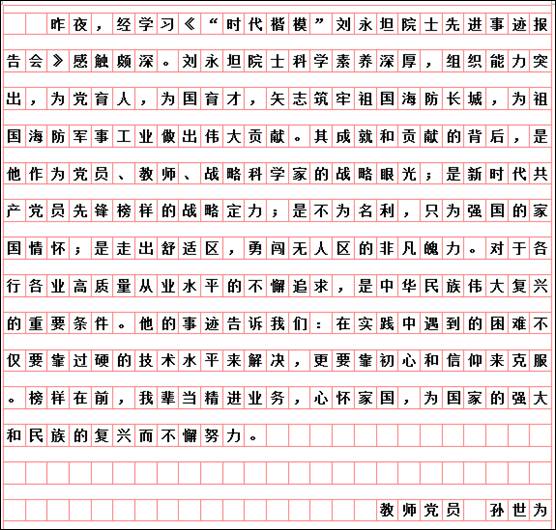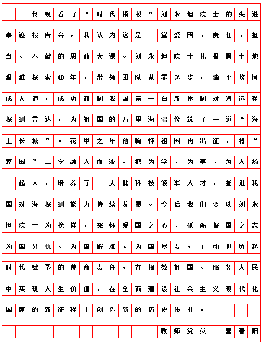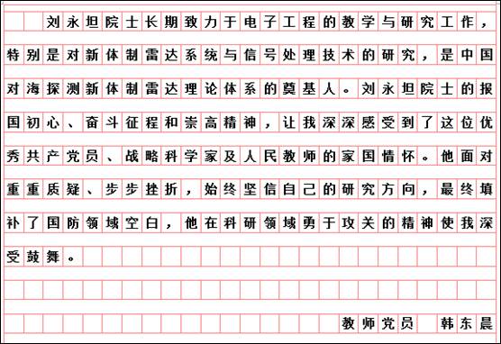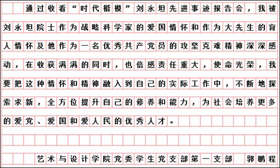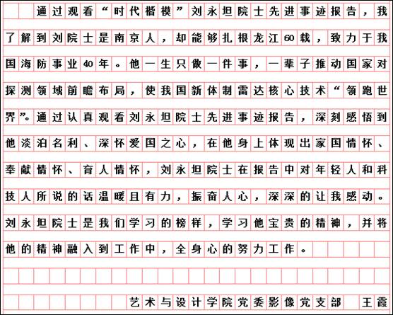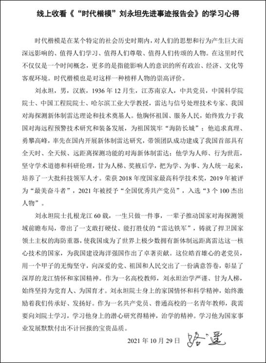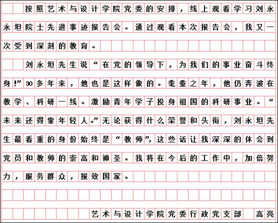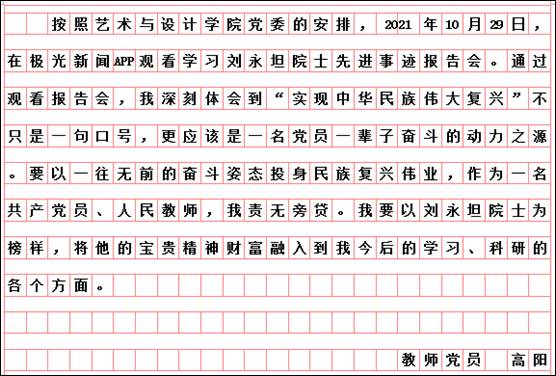 按照市委学组办《关于线上收看“时代楷模”刘永坦先进事迹报告会的通知》和学校党委宣传部、组织部要求,艺术与设计学院党委组织全体党员于10月29日19时,通过“极光新闻”客户端直播收看报告会,师生反响热烈。各支部书记又组织教师党员结合工作实际书写观后感言,深入开展艺术与设计学院“迎接校第二次党代会召开,亮身份、领任务、做表率”活动。教师党员韩东晨、冀德玉、董春阳、王志海、王惠、郭杨、杨扬、高阳、高亮、孙世为、王霞、郭鹏程、祝远、田闯、路遥、学生党员王敬然、学生干部杨洁和聂智美等认真撰稿,向楷模学习,为哈尔滨学院的快速发展助力,为艺术与设计学院的美誉度而努力工作!