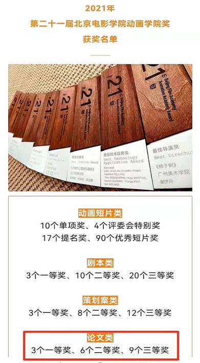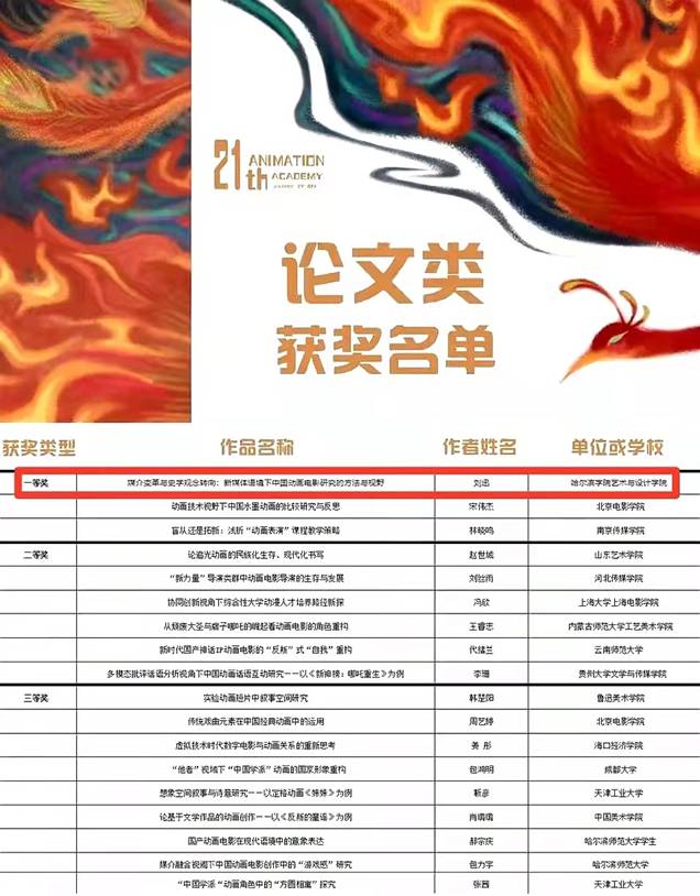 2021年11月13日,“第二十一届北京电影学院动画学院奖”获奖名单公布。我校艺术与设计学院动画专业刘迅副教授的论文《媒介变革与史学观念转向:新媒体语境下中国动画电影研究的方法与视野》荣获“第二十一届北京电影学院动画学院奖论文类一等奖”。