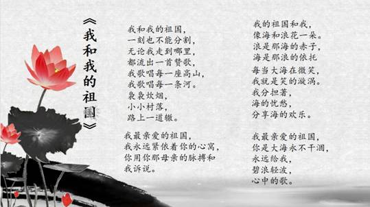 第一个环节是听歌曲,全体师生共同欣赏歌曲《我和我的祖国》。