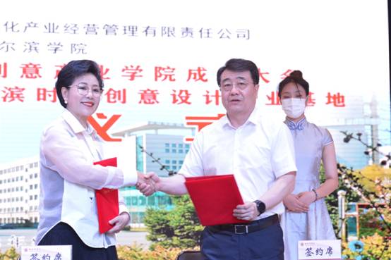 为了充分发挥创意设计产业在建设“六个龙江”和打造哈尔滨“七大都市”中的作用,哈尔滨学院与优秀企业代表哈尔滨红博商业,立足国家和省市创意设计产业要素聚集,以教育赋能创意设计产业高质量发展,全面打造哈尔滨创意设计新高地。现依托艺术与设计学院和红博商业西城红场,谋划新时代时尚创意设计的内涵,助力创意设计产业发展新格局构建,于2022年8月13日,在哈尔滨学院音乐厅召开了哈尔滨学院时尚创意设计产业学院成立大会,举办了哈尔滨时尚创意设计产业基地签约仪式。
