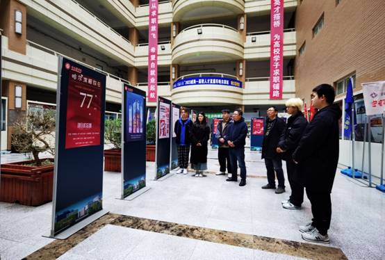 此次展览以学习贯彻习近平新时代中国特色社会主义思想主题教育为指导,共计展出由在校学生设计的反映哈尔滨城市历史文化和城市精神的主题海报40余件。策展人为哈尔滨学院副处级辅导员,黑龙江四大精神文创展览馆副馆长郭鹏程。艺术与设计学院、时尚创意设计产业学院党委书记孙国辉及部分师生观看了展览。