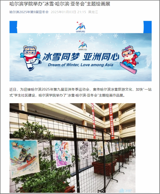 (文/郭鹏程)2024年八月以来,哈尔滨2025年第九届亚洲冬季运动会官方微信公众号、官网6次报道了我校艺术与设计学院举办的“喜迎亚冬会,相约哈尔滨”系列活动,展现了学校对亚冬会的热情支持与积极参与。