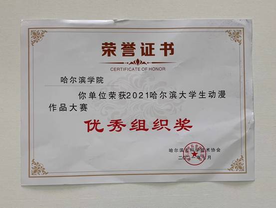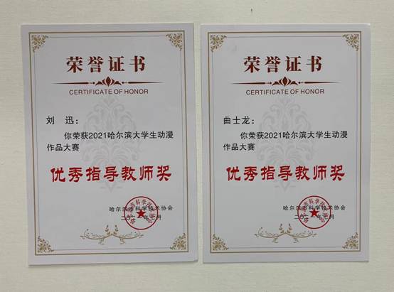 2021年11月4日,“2021哈尔滨大学生动漫作品大赛”获奖作品及优秀组织单位名单公布。本次大赛在艺术与设计学院影像艺术系主任孙作范教授的积极组织下完成了作品上报及各项参赛程序,哈尔滨学院荣获“2021哈尔滨大学生动漫作品大赛优秀组织奖单位”称号。动画专业刘迅副教授指导学生获漫画类一等奖2项、二等奖3项、三等奖4项;曲士龙副教授指导学生获动画类二等奖1项、三等奖1项。
