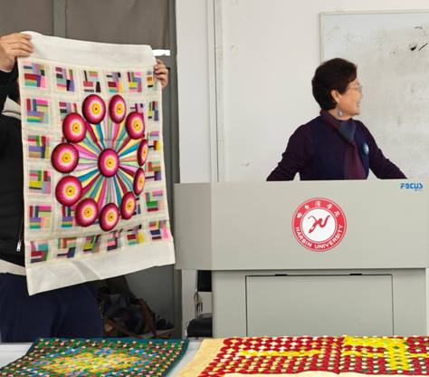 讲座最后,金媛善老师现场展示了她的拼布作品,并详细介绍了最具代表性的作品《百花争艳》,该作品获得中国流行色协会 “色彩中国2017” 中国传统工艺色彩大奖(拼布类),作品共有349朵太阳花,采用叠花、平针、倒三针、撩针等技艺,用了7万多块丝绸布块,历时7年才制作完成。金媛善老师的作品让在座师生深刻体会到了中国文化的独特风貌和沉静典雅、变幻无穷的魅力与韵味。