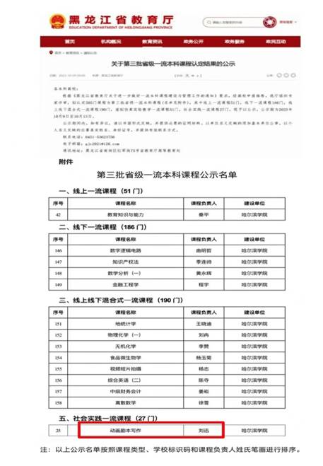 2023年10月,哈尔滨学院艺术与设计学院动画专业刘迅教授获批第三批省级一流本科课程《动画剧本写作》。