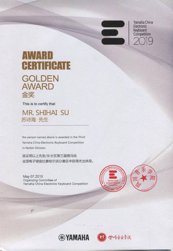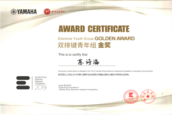 二十二、2019年4月哈尔滨学院学生苏诗海获第三届雅马哈全国电子键盘(黑龙江赛区)双排键电子琴成人组金奖。