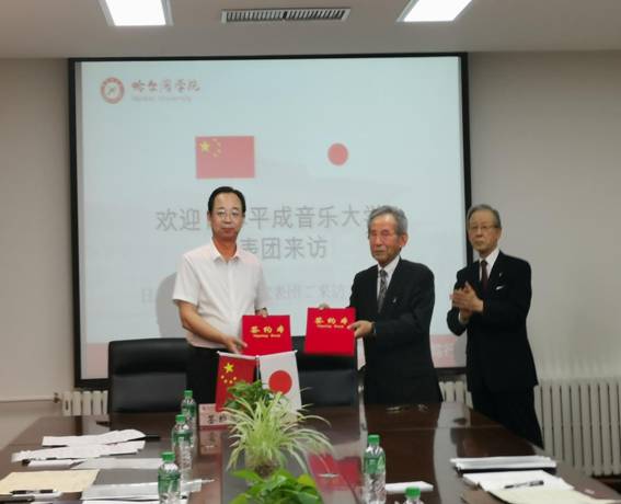 二十七、2019年6月5日在哈尔滨学院,胡宝忠校长代表中国哈尔滨学院与日本平成音乐大学签署双排键电子琴合作交流协议。