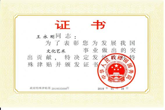 二十、2019年1月16日双排键电子琴教授王永刚被中华人民共和国国务院授予享受国务院政府特殊津贴。