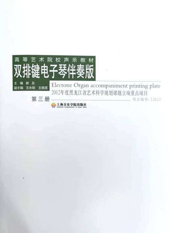 八、2014年12月王永刚教授主编的高等艺术院校声乐教材《双排键电子琴伴奏版》1至3册在上海音乐学院出版社出版发行。