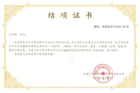 七、2014年7月王永刚教授获国家社会科学基金艺术学一般项目《电子管风琴为声乐编曲伴奏的应用研究》,项目编号2014BD02734。