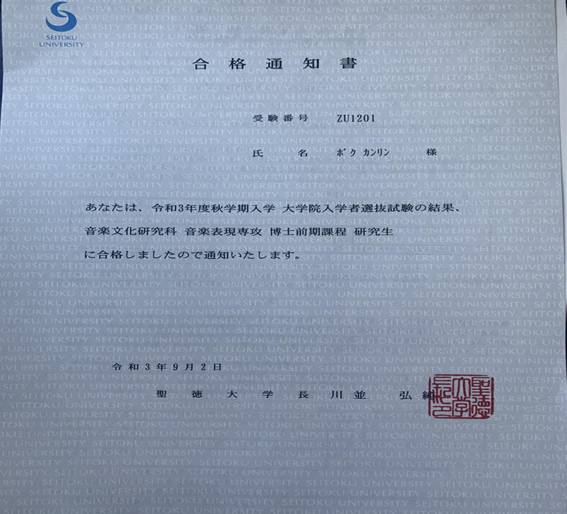三十一、2021年9月2日哈尔滨学院与日本平成音乐大学国际合作交流项目结出硕果,朴冠霖考取日本圣德大学双排键电子琴研究生。