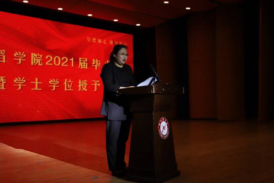 学院党总支书记马丽娟进行了热情洋溢的讲话,语重心长地嘱咐全体毕业生要立爱国志,成才报国。希望同学们坚定信念,坚持梦想,敢于担当,在努力拼搏中不断超越自我。