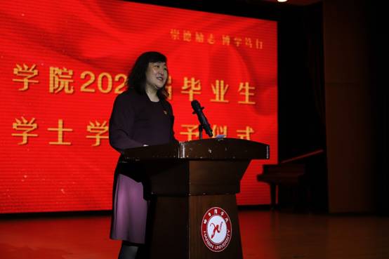 学院党总支书记马丽娟进行了热情洋溢的讲话,语重心长地嘱咐全体毕业生要立爱国志,成才报国。希望同学们坚定信念,坚持梦想,敢于担当,在努力拼搏中不断超越自我。