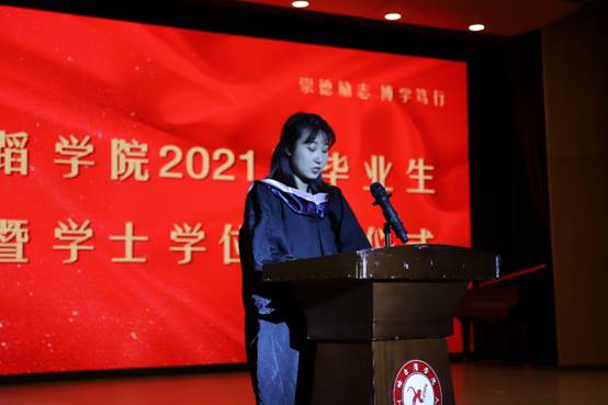 典礼在庄严的国歌声中开始,首先由院长陶亚兵致辞,他对2021届毕业生表示了祝贺,用校训“崇德励志 博学笃行”作为对毕业生的勉励,并鼓励同学们要乐观豁达、永不言弃,嘱咐同学们要心存感恩、常回母校,表达了学院对毕业生的不舍与支持。
