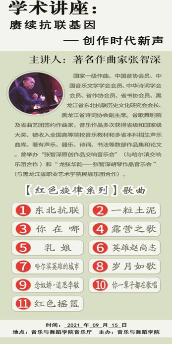 9月16日,以新生入学教育为契机,开启了本学期首场系列讲座。学院聘请著名作曲家张智深老师为部分教师和2021级全体新生做了题为《赓续抗联基因,创作时代新声》的专题报告,报告会由院长陶亚兵教授主持。