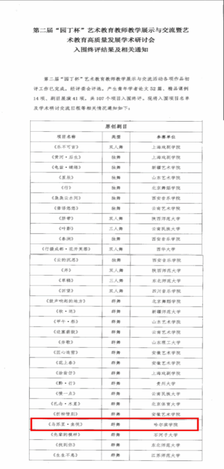 2024年6月8日,由中国人类学民族学研究会艺术人类学专业委员会、安徽艺术学院主办,安徽艺术学院舞蹈学院承办,国内百家以上艺术院校、系、科协办:“躬耕园丁 为国育人”第二届全国“园丁杯”艺术教育教师教学展示与交流暨高质量艺术教育教学学术研讨会初审结果公布。本次教学展示我校舞蹈系作品与北京舞蹈学院、上海戏剧学院、西安音乐学院、四川音乐学院等舞蹈类专业高校进行初审节目报送,最终原创作品《乌苏里·鱼悦》在激烈的角逐中脱颖而出入围终评。