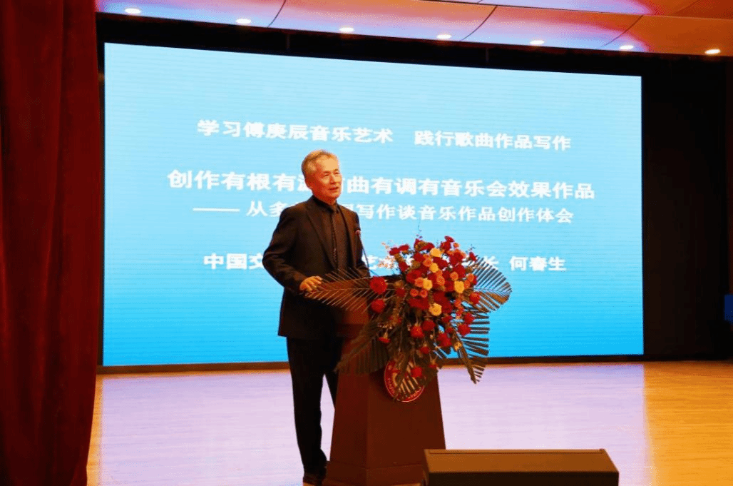 讲座伊始,何春生老师深情地回忆了与傅庚辰先生的相识经历,并分享了傅庚辰先生在音乐创作道路上的点点滴滴,介绍了傅庚辰先生的创作风格,概括总结了傅庚辰先生“诚挚于人生、执着于事业、忠诚于理想”的艺术追求和心系时代、为人民服务的质朴情怀,使师生们对傅庚辰先生的艺术成就有了更加直观和深刻的认识。