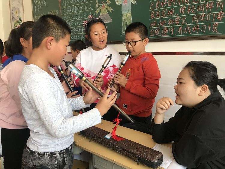 朱广佳同学与七小的同学们一起进行巴乌吹奏课后演练。